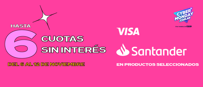 C.f.t.n.a:0% (cartera de consumo). Tasa fija nominal anual: 0%. Tasa fija efectiva anual 0%. Tres cuotas sin interés y 10% off sin tope de reintegro. Beneficio válido exclusivamente para compras realizadas entre el 06/11/2023 y el 12/11/2023 con tarjetas de crédito y débito visa Santander en locales adheridos de la república argentina. La promoción aplica a pagos a través de billetera virtual modo y/o tarjeta física. Banco Santander argentina s.a. es una sociedad anónima según la ley argentina. Ningún accionista mayoritario de capital extranjero responde por las operaciones del banco, en exceso de su integración accionaria (ley 25.738) CUIT: 30-50000845-4.
