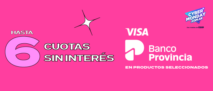 Cartera de Consumo.Tasa Nominal Anual, en adelante “TNA”: 0,00%, Tasa Efectiva Anual, en adelante “TEA”: 0,00%, Costo Financiero Total Efectivo Anual, en adelante “CFTEA”: 0,00%.“CFTEA”+IVA: 0,00%. Promoción de hasta 6 cuotas sin interés en el precio de contado, para compras realizadas en el País. Válida para los días comprendidos entre el 06/10/2023 al 31/12/2023, para compras realizadas con Tarjeta Banco Provincia Visa, Tarjeta Banco Provincia MasterCard, en productos seleccionados. Promoción valida únicamente en los comercios adheridos. Dicha promoción no es acumulable con otras promociones vigentes. Ejemplo: Una compra de $1000 y se paga en 6 cuotas: el valor de cada cuota será de $166.67. No aplica para compras con tarjeta de Débito. Válido también para pagos realizados a través de MODO con Tarjetas Banco Provincia. La promoción no aplica a pagos a través de billeteras virtuales. Banco Provincia solo es el medio de pago para la adquisición del producto/servicio. Tasa Nominal Anual “TNA”: 0,00%, Tasa Efectiva Anual “TEA”: 0,00%, Costo Financiero Total Efectivo Anual “CFTEA”: 0,00%.“CFTEA”+IVA: 0,00%.