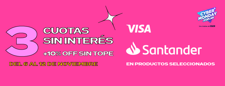 C.f.t.n.a:0% (cartera de consumo). Tasa fija nominal anual: 0%. Tasa fija efectiva anual 0%. Tres cuotas sin interés y 10% off sin tope de reintegro. Beneficio válido exclusivamente para compras realizadas entre el 06/11/2023 y el 12/11/2023 con tarjetas de crédito y débito visa Santander en locales adheridos de la república argentina. La promoción aplica a pagos a través de billetera virtual modo y/o tarjeta física. Banco Santander argentina s.a. es una sociedad anónima según la ley argentina. Ningún accionista mayoritario de capital extranjero responde por las operaciones del banco, en exceso de su integración accionaria (ley 25.738) CUIT: 30-50000845-4.